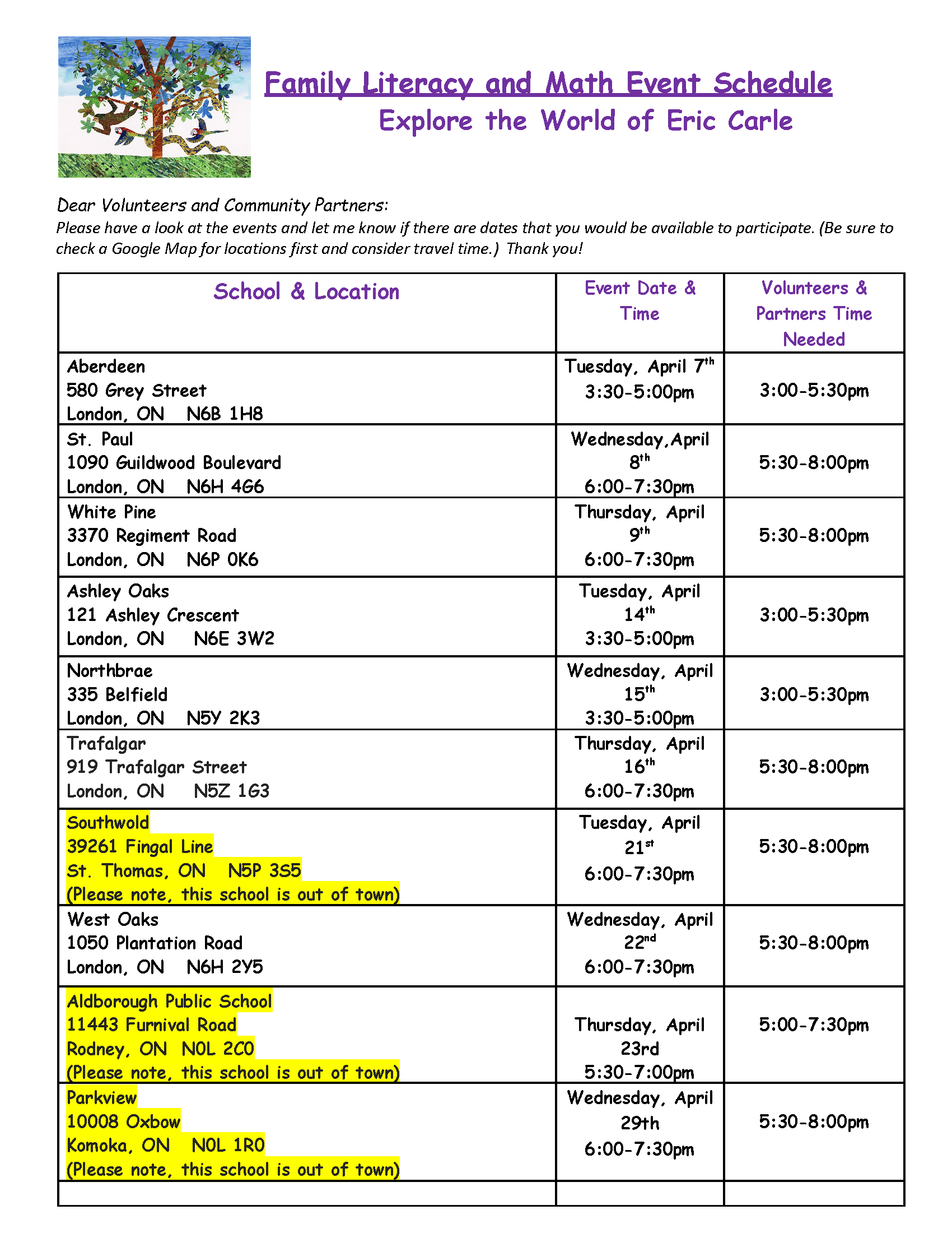 If you can volunteer for our upcoming Family Literacy and Math Events, please contact tbolzon@investinginchildren.on.ca